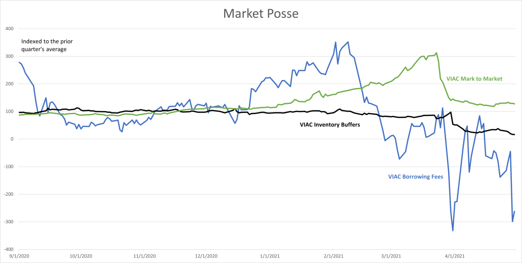 VIAC’s share price bubbled up as increasing demand from short sellers raised the borrowing fees and collateral margin for new loans. Inventory buffers were strained when larger shorts entered the trading pits. And Archegos finally imploded when creditors opposed further credit extensions.
